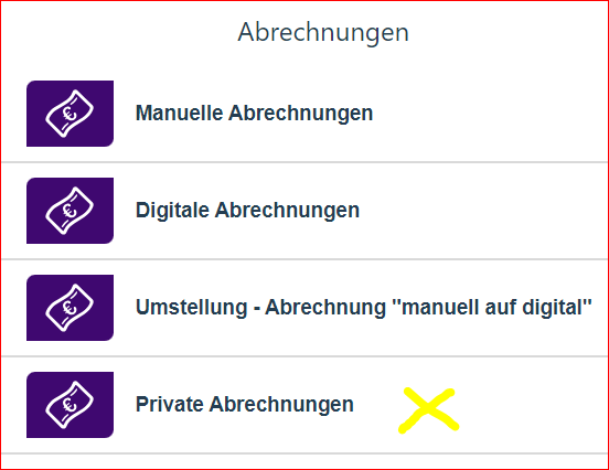 1. Gehen Sie in das Modul "Abrechnungen" -- "Private Abrechnungen". Erfassen Sie die Unterschriften digital, gehen Sie in "Digitale Abrechnung (Privatkunden)", ansonsten in die manuelle Abrechnung.