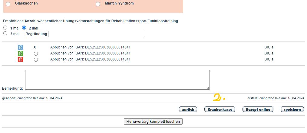 ... und das andere Mal bezieht dieser sich auf die Verordnung ("Mit welchem Kostenträger rechne ich den Rehasport ab?"). Dazu öffnen Sie die Verordnung mit "ändern", danach können Sie den Kostenträger eintragen s. 2.