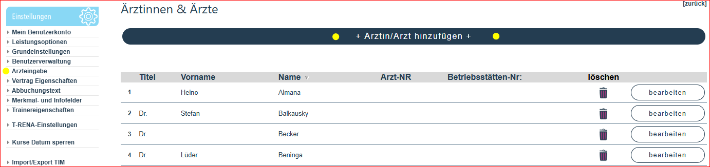 Anlage der Arztliste in myYOLO und die dazu gehörigen Angaben.