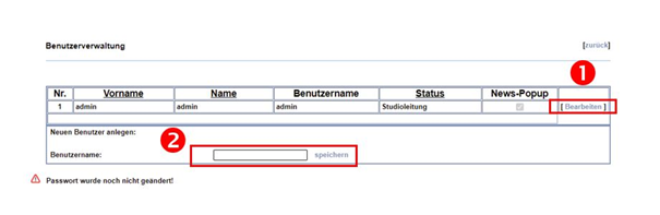 - Über den Button (1) [Bearbeiten] können Sie Angaben für den jeweiligen Benutzer ändern oder Sie legen über das Eingabefeld (2) "Benutzername: _____________ speichern" einen neuen Benutzeraccount an.