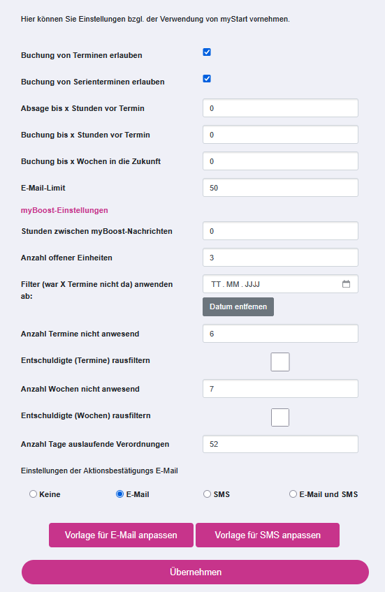 Wieviel Stunden vor Kursbeginn die myStart Nutzer ihren Termin noch absagen dürfen, setzt du hier fest.