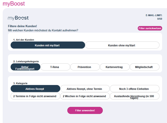Mit dieser Einstellung findest du ablaufende Verträge, Verordnungen etc.. So kannst du z.B. die Rehasportler daran erinnern, sich eine neue Verordnung ausstellen zu lassen oder z.B. deine Teilnehmer an Präventionskursen zu verabschieden und darauf hinzuweise, sich die Bescheinigung abzuholen.