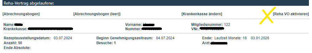 Klicken Sie auf die deaktivierte/abgelaufene Rehaverordnung und aktivieren Sie anschließend die Reha VO.