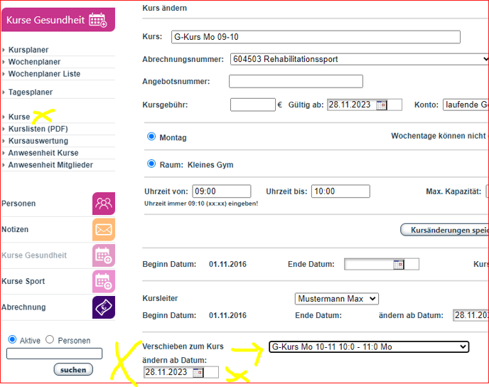 Falls Sie einen Kurs nicht anpassen können (z. B. hinsichtlich Termin, Wochentag oder Raum), erstellen Sie in der Kursanlagemaske einen neuen Kurs, der zu den gewünschten Änderungen passt, beispielsweise an einem anderen Wochentag.
