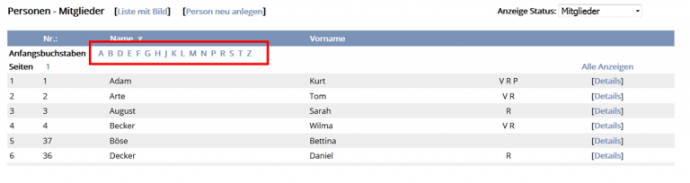 - Mit betätigen der “Nr.” sortiert die Tabelle die Personen / Mitglieder nach Ihrer Kundennummer.