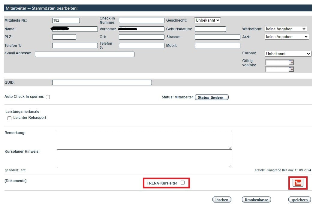 T-RENA Kursleiter werden in der Stammdatenverwaltung erfasst und erhalten den Status "Mitarbeiter". Um T-RENA-Verordnungen erstellen zu können, ist es erforderlich, dass der Kursleiter zuvor im System angelegt und als T-RENA Kursleiter gekennzeichnet wird.