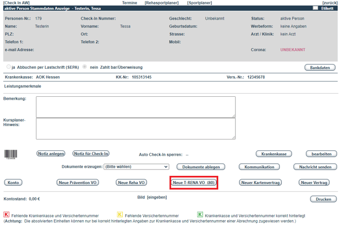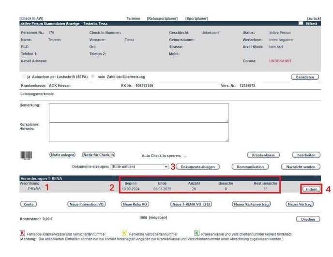 • Um eine neue T-RENA-Verordnung / eine Verlängerung einzupflegen, müssen Sie den Button [Neue T-RENA- VO] innerhalb der Mitglied Stammdaten Anzeige betätigen.