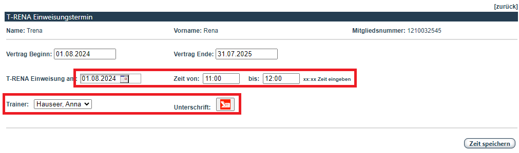 Nachdem Sie diesen Button ausgewählt haben, geben Sie bitte das Datum des Einweisungstermins ein. Weiterhin wird hier der Trainer ausgewählt, der den Einweisungstermin leitet. Dieser ist verpflichtet, an dieser Stelle seine digitale Unterschrift zu leisten. (Im Falle einer Verlängerung findet kein weiterer Einweisungstermin statt.)