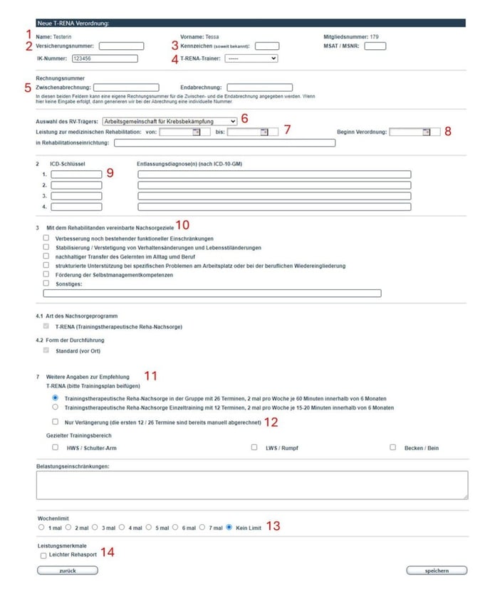 11. Hier können Sie die Anzahl der vorgesehenen Termine sowie die Trainingsdauer gemäß der T-RENA-Verordnung festlegen.