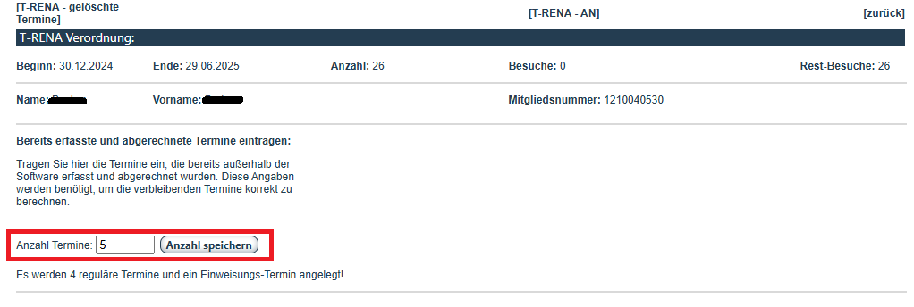 Nun hast du die Möglichkeit, die bereits bei einem anderen Anbieter durchgeführten und abgerechneten Termine einzutragen (Trainingseinheiten + Einweisungstermin). Dadurch wird die Anzahl der erforderlichen Trainingseinheiten automatisch aktualisiert.