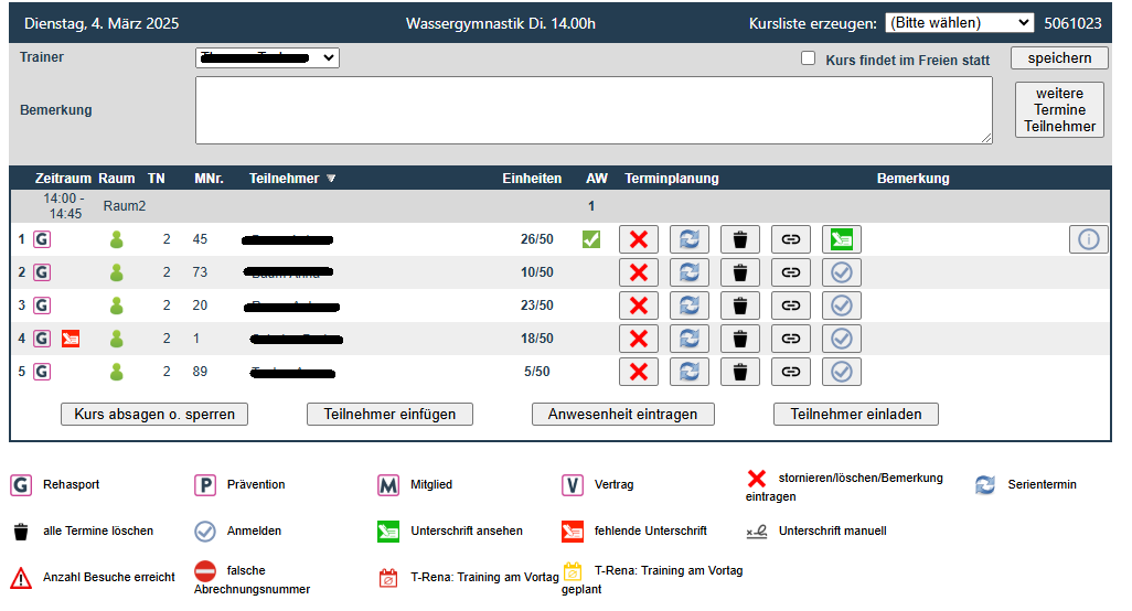 Teilnehmer Anwesenheiten im Kursplaner setzen sowie Anwesenheiten nachträglich setzen.