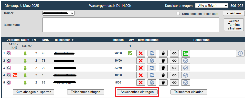 1. Innerhalb Ihres Kurses im Kursplaner betätigen Sie den Button [Anwesenheiten eintragen].