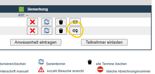 Um die Verkettung zu beenden, können Sie im Rehasportplaner die zukünftigen Termine löschen. Dadurch wird das automatische Fortsetzen der Verkettung unterbrochen. Bitte beachten Sie, dass Sie die Option "Alle Termine anzeigen" aktivieren sollten. Alternativ haben Sie auch die Möglichkeit, die Terminverkettung über den "Mülleimer"-Button im Kursplaner zu entfernen.