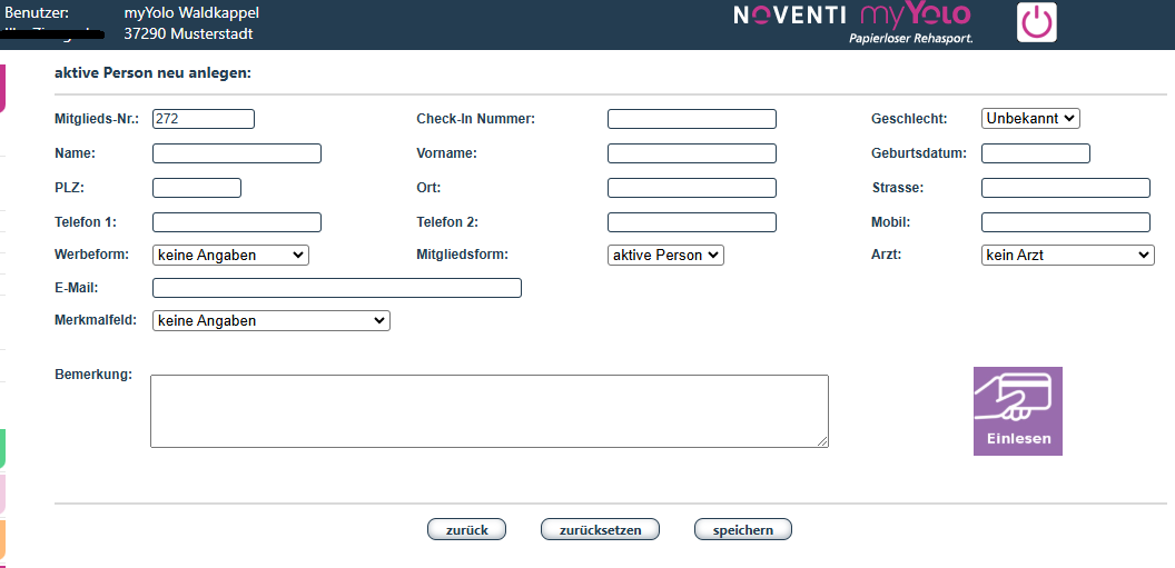 - Check-In Nummer: Hier wird der RFID-Chip eingepflegt, der mit dem Lesegerät