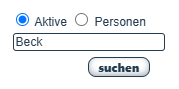 Über die Eingabe der ersten Buchstaben des Namens (> Beispiel: Beck für Becker) wird Ihnen die gesuchte Person angezeigt. - Wenn Sie “Aktive” ausgewählt haben, durchsucht die Anwendung alle aktiven Kunden. (Aktive Personen sind alle Personen, die eine Stammdate besitzen,
