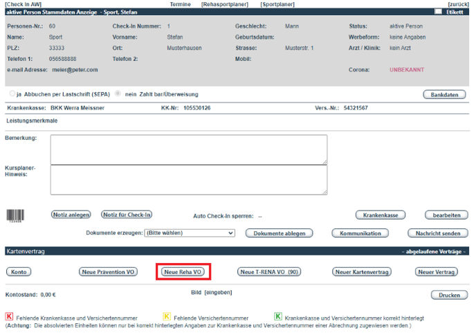 • Um eine neue Rehasportverordnung / eine Verlängerung einzupflegen, müssen Sie den Button [Neue Reha VO] innerhalb der Mitglied Stammdaten Anzeige betätigen.