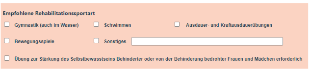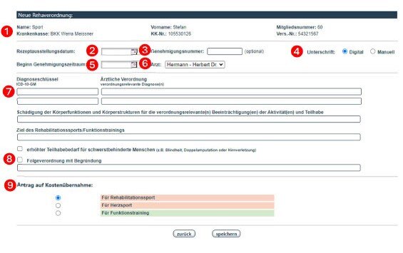 9. Auswahl der Verordnung ob es sich bei der Verordnung um eine Rehabilitationssportverordnung, Herzsportverordnung oder eine Verordnung für Funktionstraining handelt.