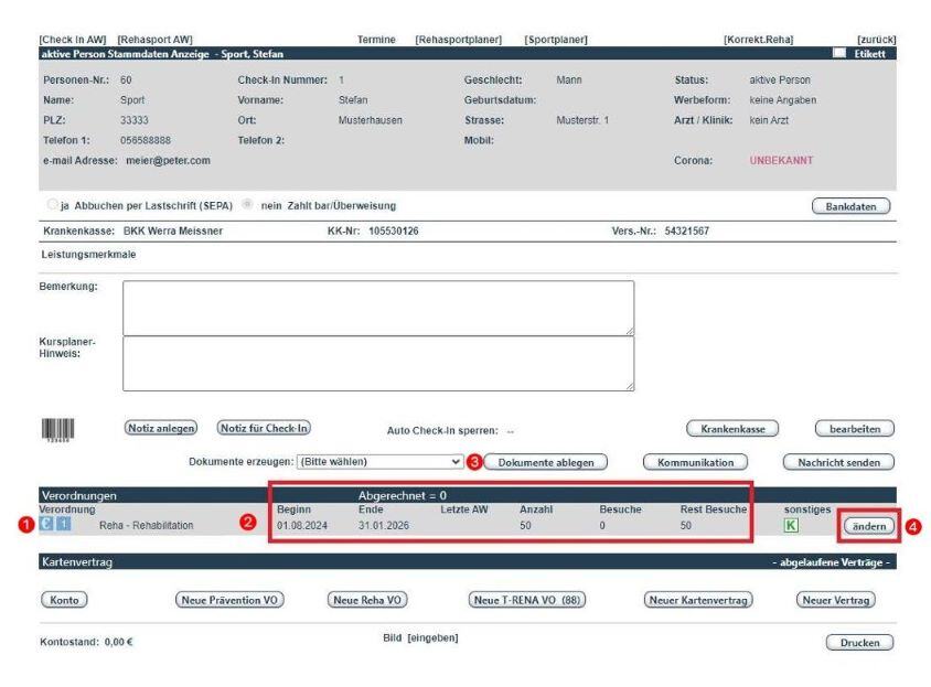 2. Beginn der Verordnung, das Ende der Verordnungslaufzeit, Anzahl der verordneten Behandlungen, bisherige Besuche.