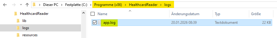 Du findest sie unter Programme (x86) - HealthcardReader - logs --> app.log.