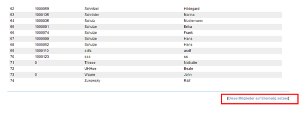 • Sie wechseln über betätigen des Buttons [anzeigen] in die Auflistung aller Mitglieder / Patienten, die über keinen Vertrag, Präventionsvertrag oder Rehabilitationssport Verordnung verfügen. Hier können Sie im Anschluss alle Personen auf ehemalig setzen.