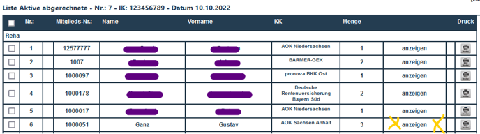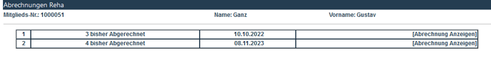 Öffnen Sie die Stammdate der Person und rufen Sie [Korrekt.Reha] auf. Dort finden Sie oben links eine Auflistung der bereits abgerechneten Einheitenblöcke unter [Reha-Abrechnungen].