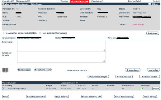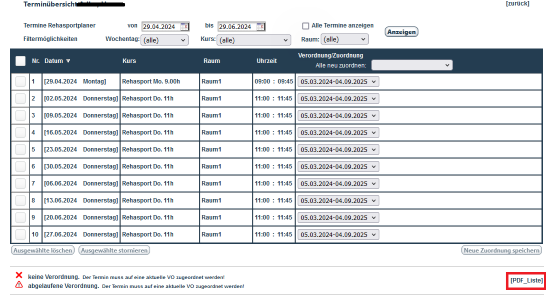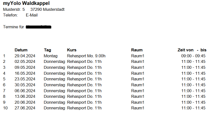 Ein PDF-Dokument über Serientermine einer einzelnen Person kann über den Rehasportplaner erstellt werden.