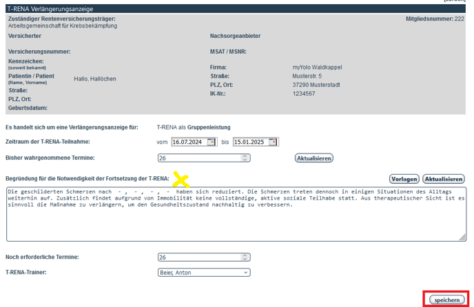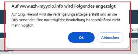 Erscheint beim Speichern folgendes Pushup-Fenster wird die Verlängerungsanzeige automatisch an die Deutsche Rentenversicherung übermittelt (dies gilt für Partner die den T-RENA-Manager nutzen).
