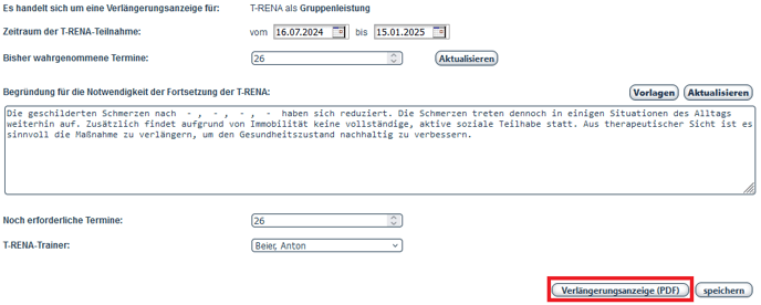 Die eingegebenen Informationen müssen gespeichert werden. Anschließend wird der Button „Verlängerungsanzeige PDF“ angezeigt.