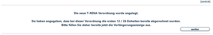 Über den Button "weiter" kommst du zur Verlängerungsanzeige. An dieser Stelle ist es erforderlich, die Begründung für die Notwendigkeit der Fortsetzung von T-RENA einzugeben. Alle weiteren erforderlichen Informationen wurden bereits automatisch aus den Daten der ursprünglichen Verordnung übernommen.